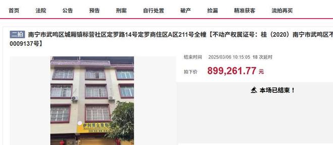 从过往拍卖来看,此前南宁市武鸣区城厢镇标营社区也有过其他自建房被拍卖,最近拍卖的一栋是去年3月份,房子位于武鸣区城厢镇标营社区定罗路14号定罗商住区,是一栋建筑面积为447.15平方米的房子,也是五层,最后是以89.9261万元成交,成交单价2011元/平方米,跟这次的这栋房子起拍价差不多,不过房子也是在第二次拍卖的时候才成交的。