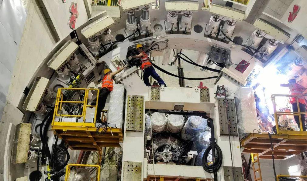 而面对高硬度石英砂岩地层时,刀具磨损快、换刀频繁的问题凸显。技术骨干们蹲守在施工现场,仔细观察着每一次刀具的磨损情况。他们根据岩石强度与破碎情况反复调试,通过优化刀具刃型及硬度、延展性指标,大幅降低刀具消耗量。换刀时,工人们在狭小的刀盘内,忍受着高温和粉尘,小心翼翼地拆卸、更换刀具,每一个动作都充满了力量与专注。正是他们的辛勤付出,将硬岩段最高单月进尺提升至306米,为工程提速提供了核心支撑。